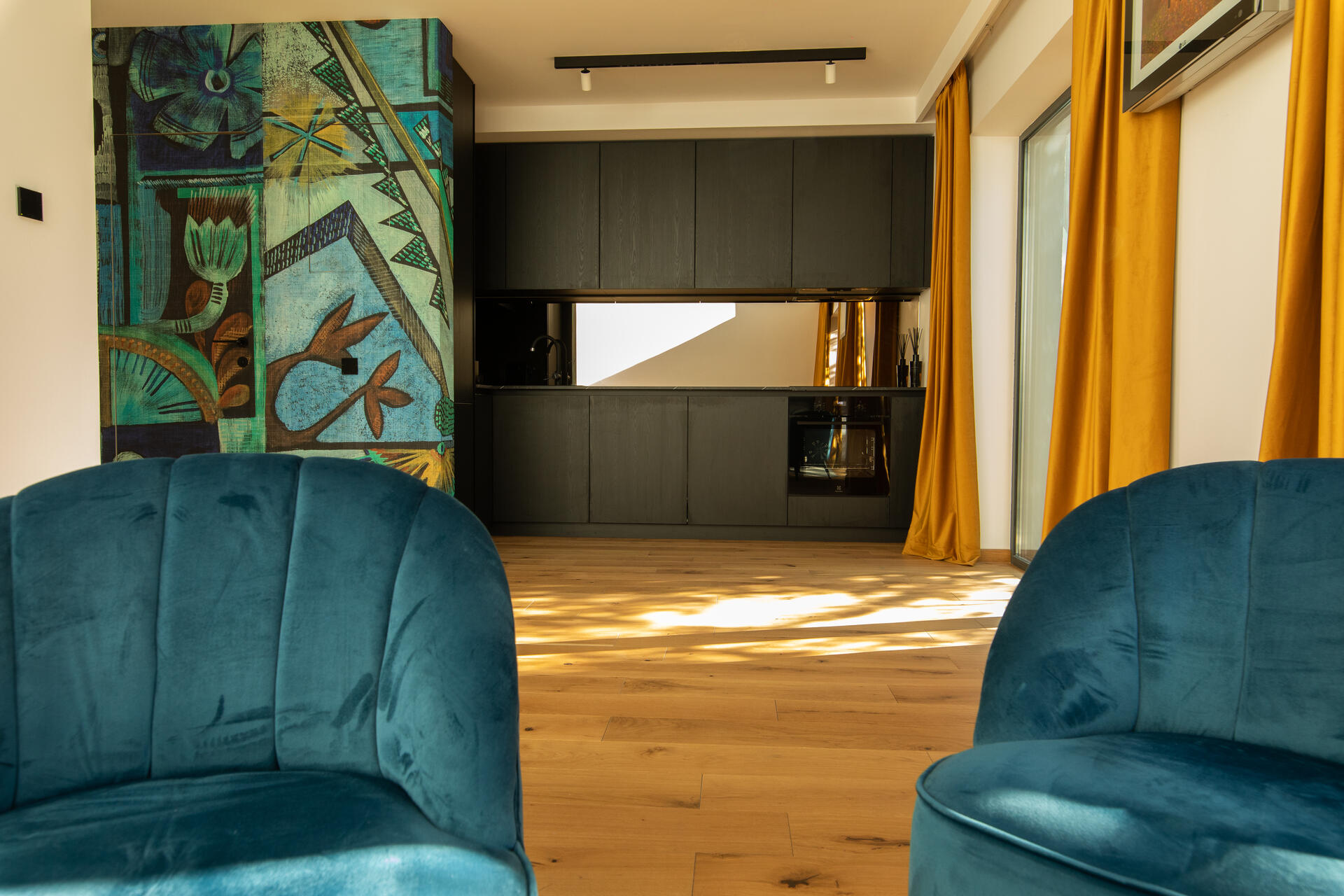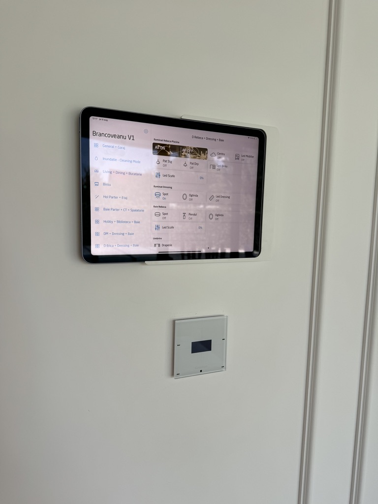 În acest apartament am integrat un sistem de automatizare cu următoarele funcționalități: